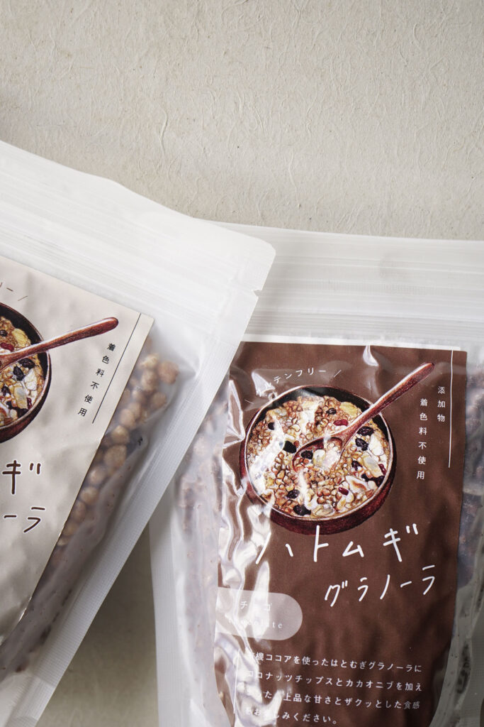 有機ココアを使ったはとむぎグラノーラに ココナッツチップスとカカオニブを加えました(チョコ)