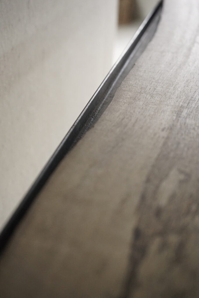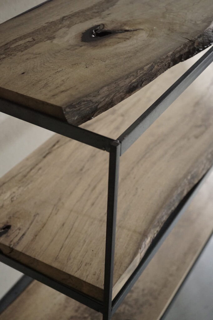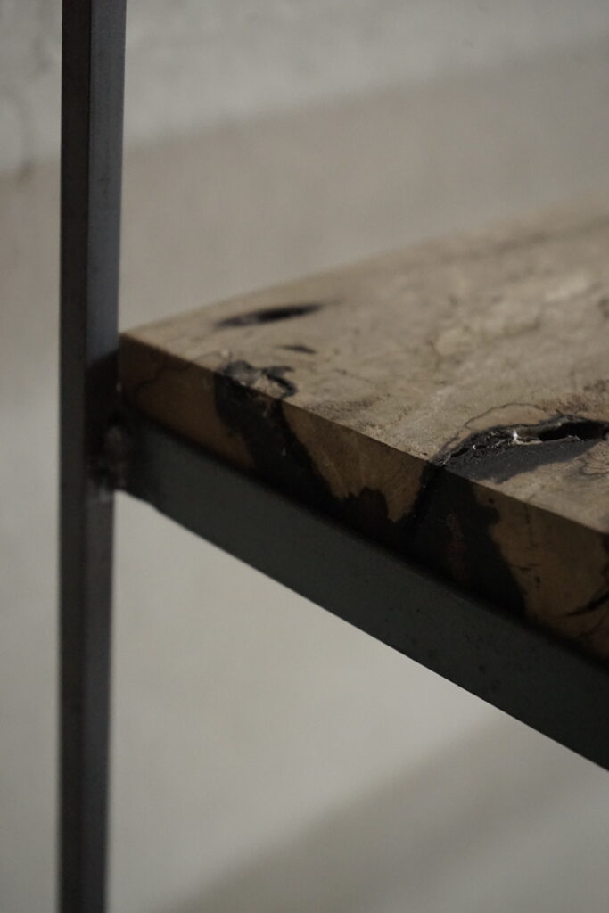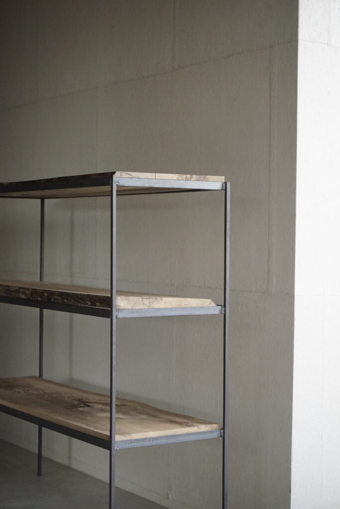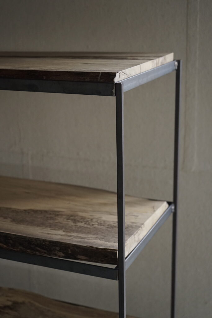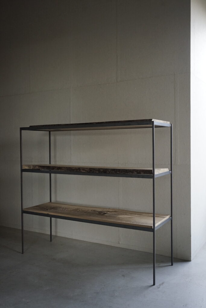 鉄と黒柿の三段棚 2026年1月22日 news 鉄に黒柿の棚板を合わせた三段棚 華奢に仕上げたすっきりとした鉄脚(縦)に対し重みのある板(横)のバランスが好み 鉄枠に対し 板の横幅は合わせてますが奥行きは木の自然な形のままその為に足りない箇所もありますが木の耳を残したその雰囲気を感じてもらえたらと思います 鉄と黒柿の三段棚 40000円税込 < prev next >
